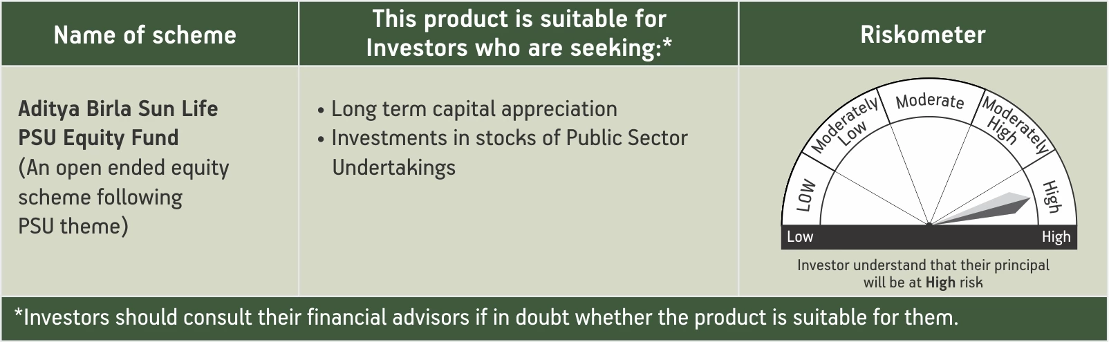 With a positive outlook for PSUs in the years to come, PSU investments can indeed prove to be hidden gems waiting to be unearthed by investors. PSU investments like most equity investments need to be nurtured over a long duration to accumulate returns. Aim to enhance the long-term component of your investment portfolio by investing in Aditya Birla Sun Life PSU Equity Fund - an open ended equity scheme following the PSU theme.