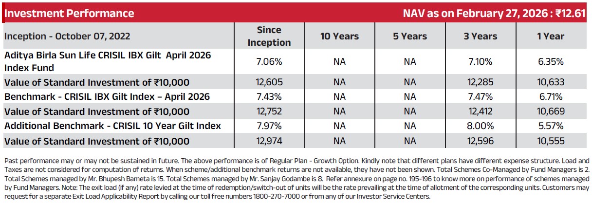 | The investment objective of the Scheme is to generate returns corresponding to the total returns of the securities as represented by the CRISIL IBX Gilt Index – April 2026 before expenses, subject to tracking errors. The Scheme does not guarantee/indicate any returns. There is no assurance that the objective of the Scheme will be achieved. | |