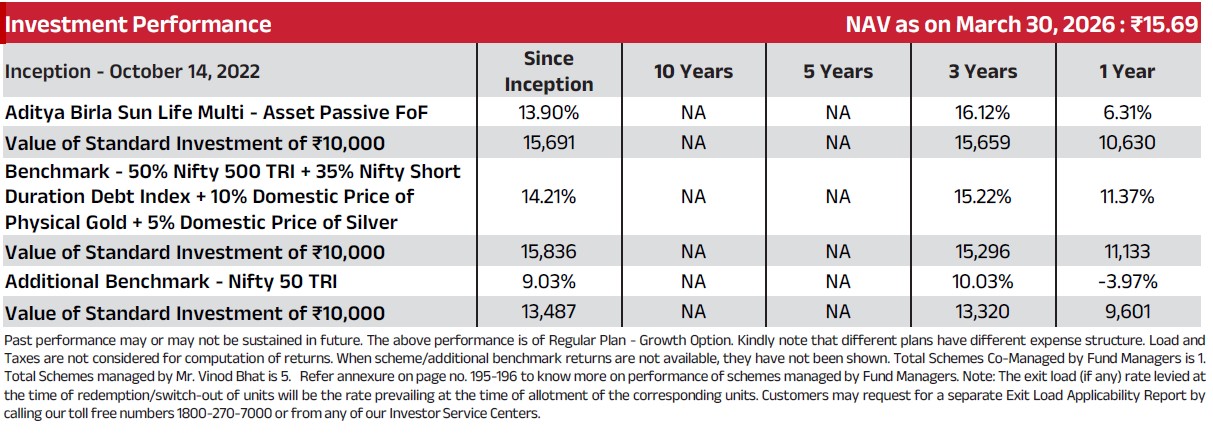 | Aditya Birla Sun Life Multi – Asset Passive FOF An open-ended fund of funds scheme investing in Exchange Traded Funds and Index Funds. |