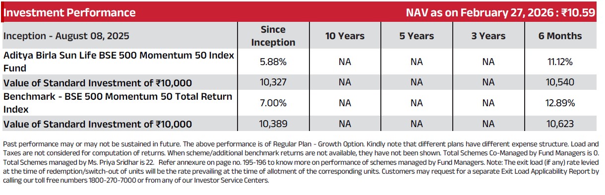 | Aditya Birla Sun Life BSE 500 Momentum 50 Index Fund An open ended Index Fund replicating the BSE 500 Momentum 50 Total Return Index |