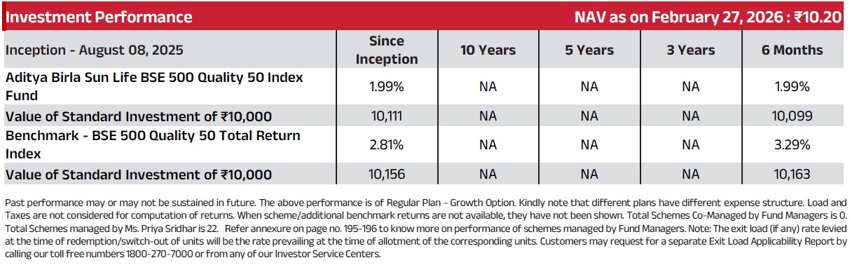 | Aditya Birla Sun Life BSE 500 Quality 50 Index Fund An open ended Index Fund replicating the BSE 500 Quality 50 Total Return Index |
