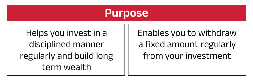 SIP is suitable for investors who want to invest regularly and grow their wealth over time through disciplined contributions. SWP is suitable for investors who want to withdraw a fixed amount periodically from their accumulated corpus, such as retirees or those seeking regular cashflows without redeeming their entire investment at once.