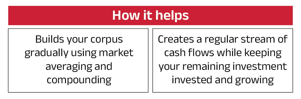 The Plan for Life strategy combines SIP to build wealth and SWP to withdraw it. You invest regularly through SIP, create a corpus over time, and later use SWP to receive fixed, periodic payouts.
