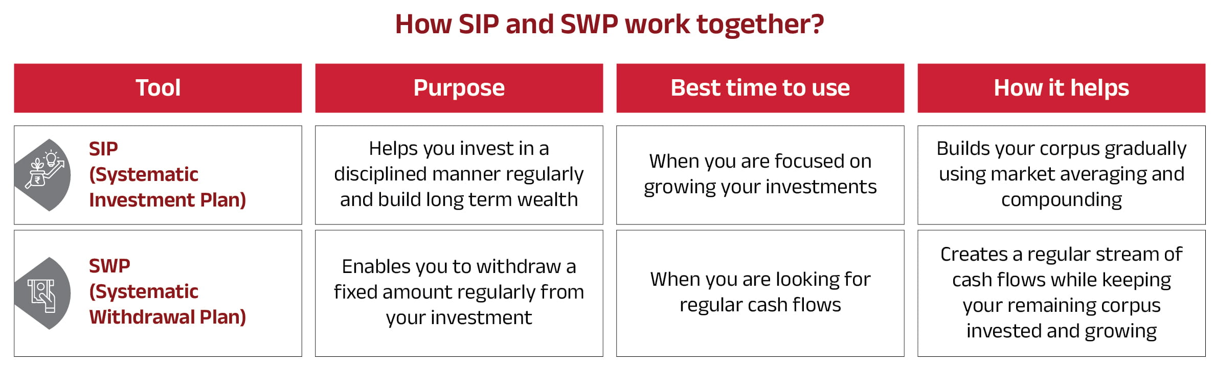 SIP and SWP together provide a structured approach. SIP enables disciplined wealth accumulation during earning years, while SWP allows systematic access to that wealth later through periodic withdrawals. This combination helps investors align their investments with both long‑term goals and evolving cashflow needs.