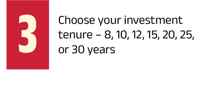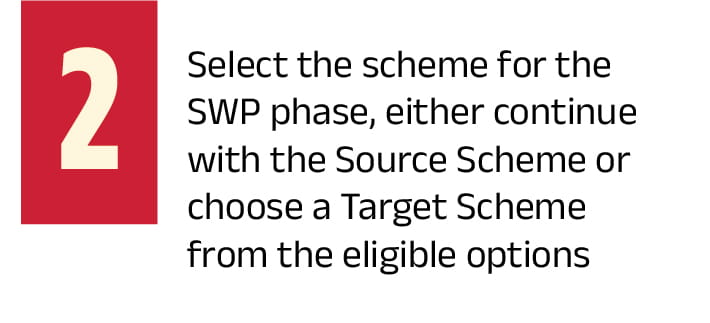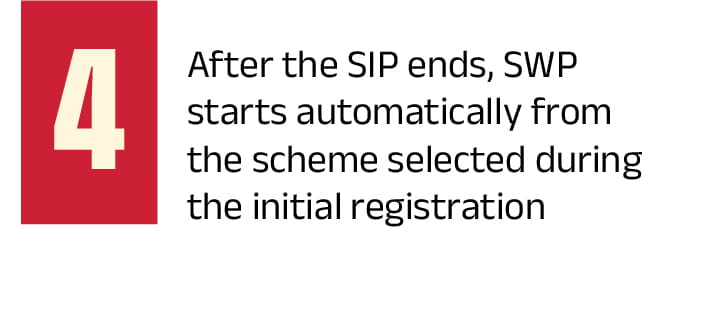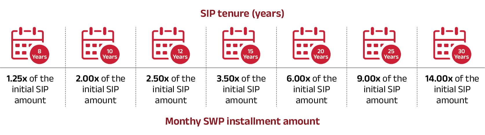 SWP begins automatically in the month following the end of your SIP tenure. You can choose SIP tenures starting from 8, 10, 12, 15, 20, 25, or 30 years. If you have selected a different Target Scheme, your corpus will be switched within 15 days before SWP begins.
